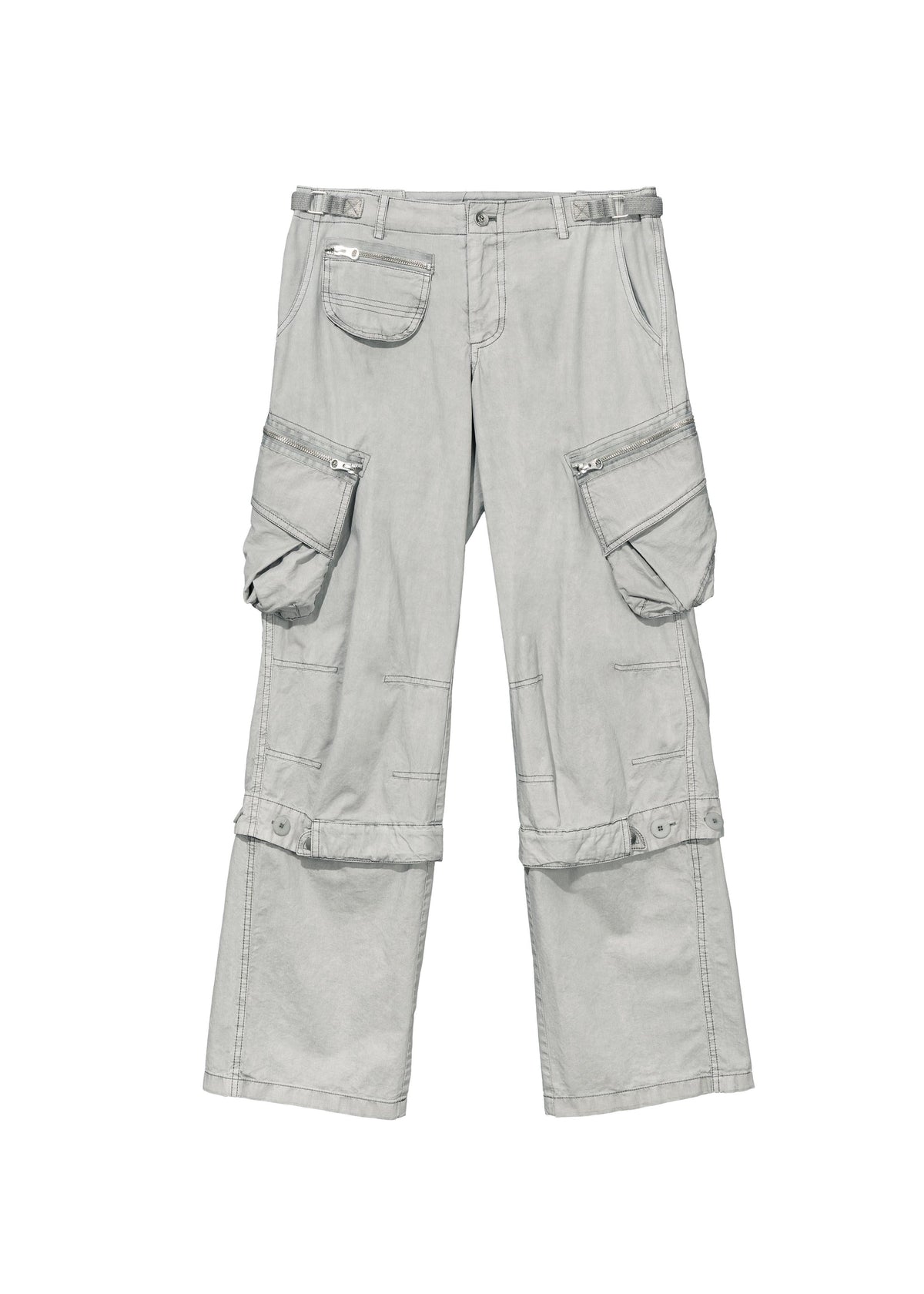 ピグメントダイ加工のコットンパンツは、裾の長さを調節できるボタン留めで、裾部分を取り外してクロップド丈のシルエットにすることも可能です。繋ぎ目のスナップボタンでさらにフィット感を調節できます。ローライズのウエストラインにはベルクロストラップが付いており、フィット感を自由に調整できます。サイドポケットはジッパーで取り外し可能で、様々なスタイリングにお使いいただけます。<サイズ&フィット>
