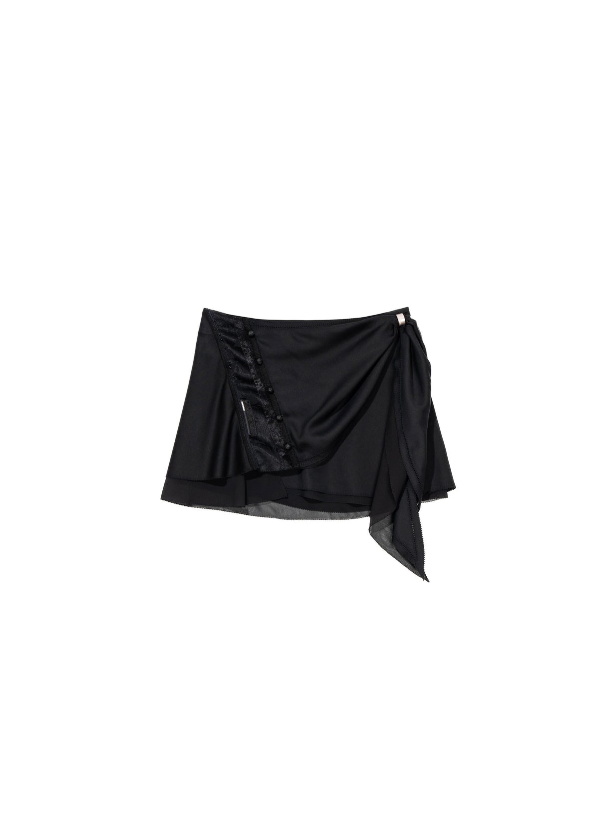 ラップスタイルのミニスカートは、無地とプリント生地を重ね、フロントにはジャカードとレースのトリミングが施されています。ガラスボタン、ビーズ、ラバーロゴラベルが装飾的なディテールを添え、生地の端はロゴが刻印された真鍮のリングに通してドレープ感を演出しています。ウエストの片側には調節可能なゴムバンドが付いており、フィット感を自由に調整できます。<サイズ&フィット>