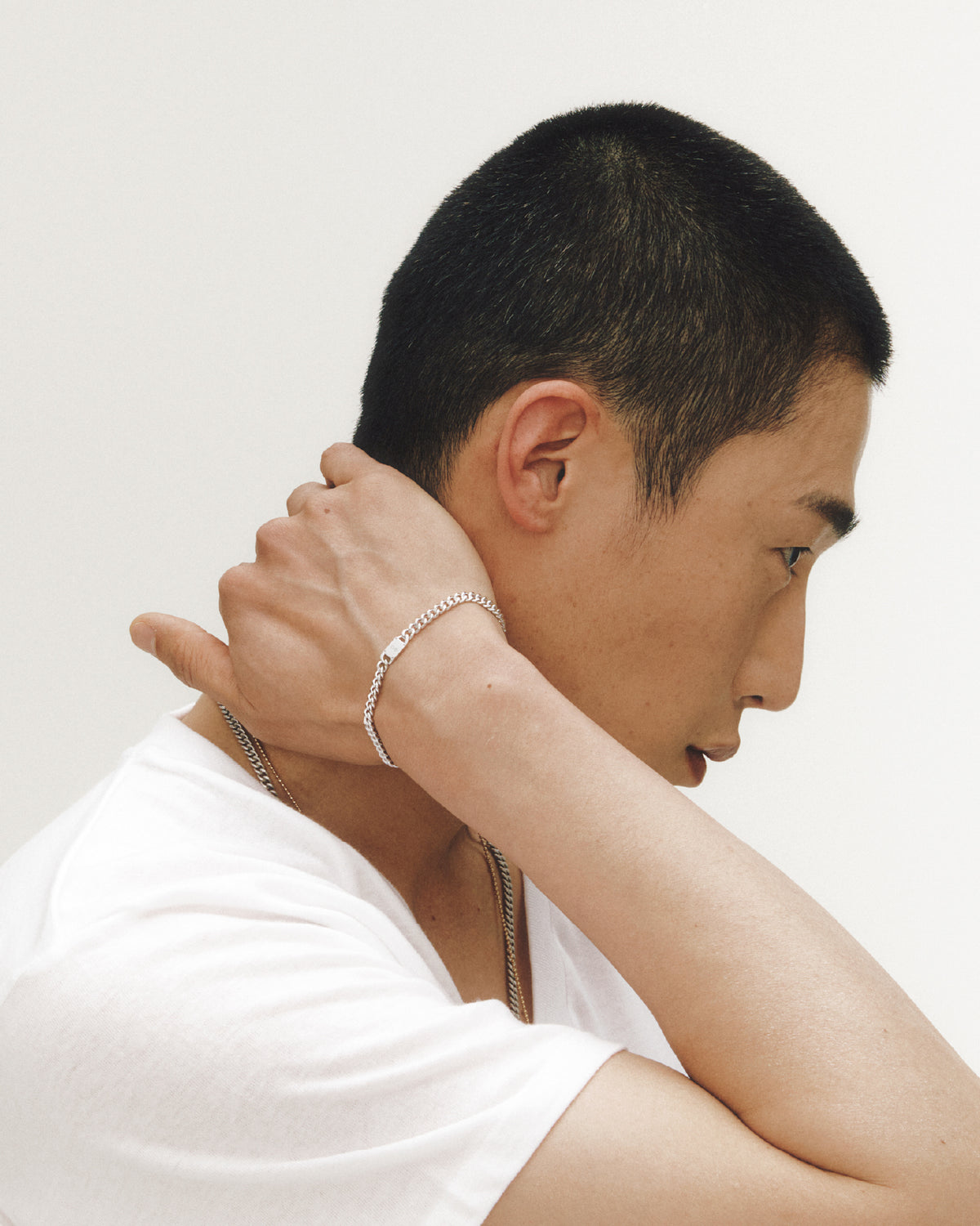 A bracelet with a mini-sized A13 pendant connected to the curve chain.It's a unique item that can be worn casually by both men and women.