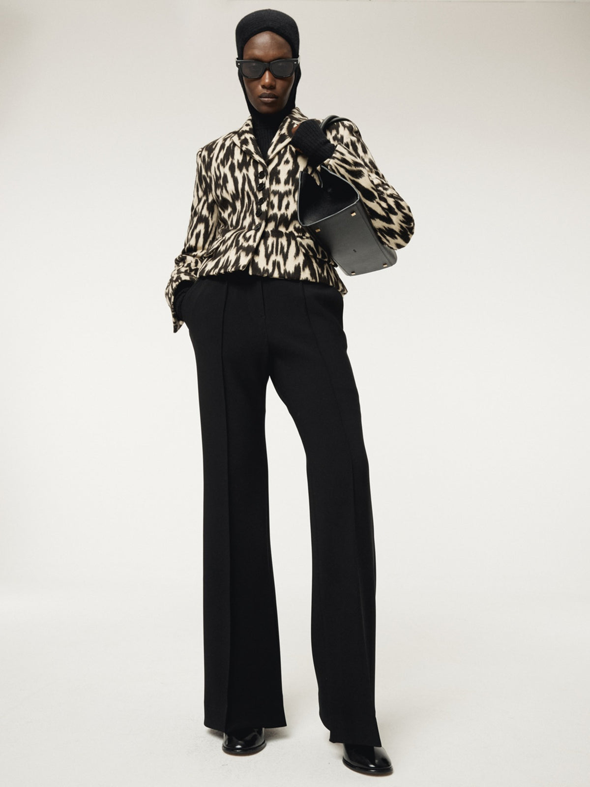 Create a slim waist and long leg line with solid crepe double jersey.Slim, spreading flare line