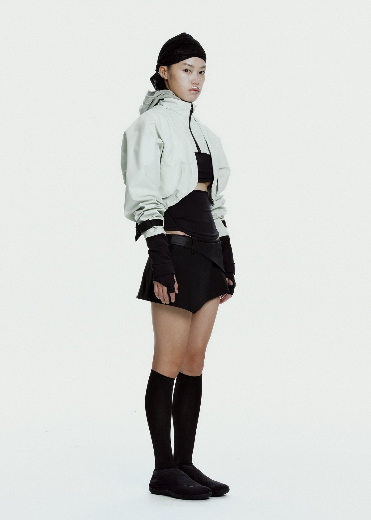 层叠式设计,短款领口和短款外套通过拉链连接,可以分开,打造多种造型;袖口带拇指孔;下摆抽绳可调节松紧;翻盖口袋。尺码与版型