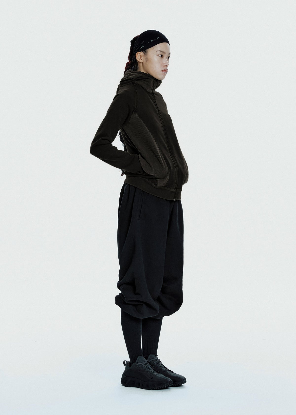 拉链连帽衫,肩部配有拉链,撞色面料细节增强了服装的结构感,袖子上有拇指孔,耳朵处有镂空细节,帽子上有开口可以拉出马尾辫。尺码与版型