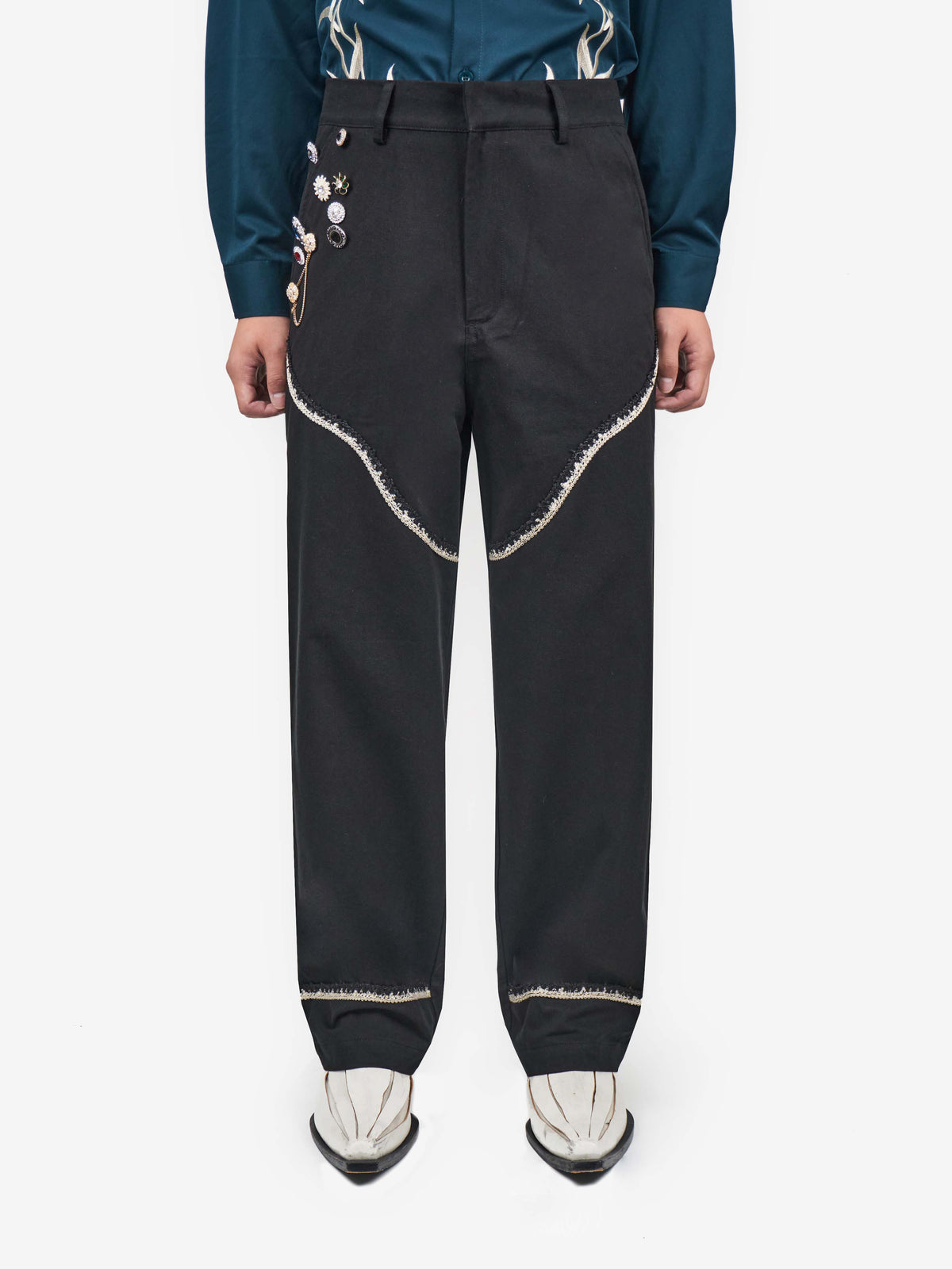 这款卡其裤在束腰线和裤脚处饰有蕾丝和粗花呢滚边,更添精致细节。右侧口袋上点缀着各式珠宝,展现出金俊泰独特的个人风格。尺码与版型