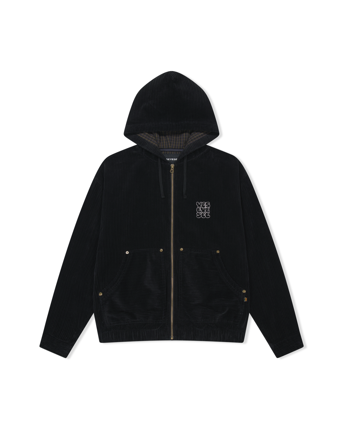 常规版型灯芯绒连帽夹克,带格子帽衬和C字刺绣标志标准版型